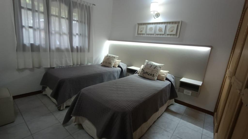 Consta de cuatro dormitorios de 3.00 x 3.00 cada uno, uno de ellos en suite con cama matrimonial, otro con cama matrimonial o dos individuales a elección, y el resto con dos camas individuales cada uno (no cuchetas), todas las camas con colchones de resortes para un total de ocho personas, tres baños (uno en suite), cocina, lavadero, comedor, living, play room de 3.40 por 2.60, garaje cerrado y galería semicubierta.